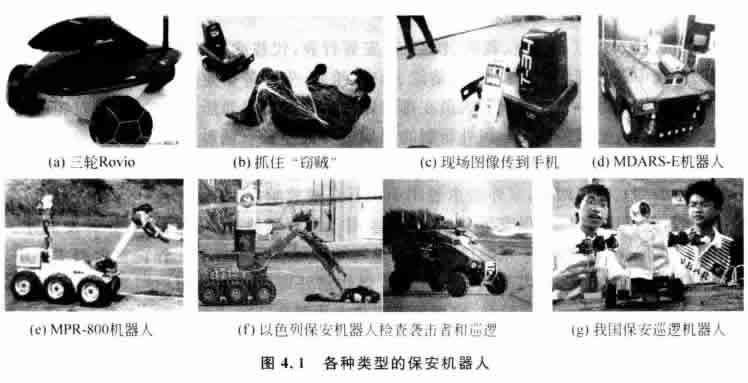 美國Z新開發(fā)的保安機器人 Rovio 可以幫助經(jīng)常外出又不放心家中物品的人。 Rovio 采用三輪和GPS 系統(tǒng),用戶可以設(shè)定幾個點,它就會在家中來回地巡邏,如圖4.1(a) 所示。Rovio 裝有攝像頭和麥克風(fēng)用于探查房屋內(nèi)的情況,除此之外,它還安裝有 LED 燈,以便夜晚能更清晰地看清周圍環(huán)境。由于攝像頭安裝在可伸縮的機械手上,所以屋 主可以控制攝像頭從前后左右不同的角度進(jìn)行觀察。 Rovio 通過 WiFi 聯(lián)網(wǎng),屋主使用手 機或者計算機即可遠(yuǎn)程遙控。日本一家公司Z近開發(fā)了一款保安機器人,它裝有新型傳 感器,可以自動地發(fā)射網(wǎng)狀物將竊賊套住,并將現(xiàn)場的圖像發(fā)到主人的手機上,如 圖4 . 1(b) 和圖4. 1(c) 所示。在美國新澤西州的一家公司里, 一臺SR2 型室內(nèi)保安機器 人每天都會在公司大樓內(nèi)狹窄的過道中巡邏。它是一臺小車式機器人,只要發(fā)現(xiàn)有煙霧 或距其30m 以內(nèi)有行人,它就會向指揮中心的值班人員發(fā)出警報。 SR2 型室內(nèi)保安機器 人是Cybermotion 公司為滿足美軍后勤部門的迫切需求而研制的。其改進(jìn)型是 MDARS-I 機器人,MDARS-I 的Z低速度為3km/h, 一次充電后可連續(xù)地工作8小時,它 可以在360°的范圍內(nèi)發(fā)現(xiàn)10m 遠(yuǎn)的物體。該機器人裝有入侵者探測用微波雷達(dá)、熱成像 儀、音響傳感器、攝像機、紅外照明器、旋轉(zhuǎn)及傾斜平臺,它還有超聲波傳感器、導(dǎo)航傳感 器、無線局域網(wǎng)絡(luò)轉(zhuǎn)接器等。當(dāng)工作人員下班后,該機器人仍然可以在倉庫內(nèi)巡邏。此 外,它還可以確定所存物品的狀況及位置,發(fā)現(xiàn)問題及時發(fā)出警報。